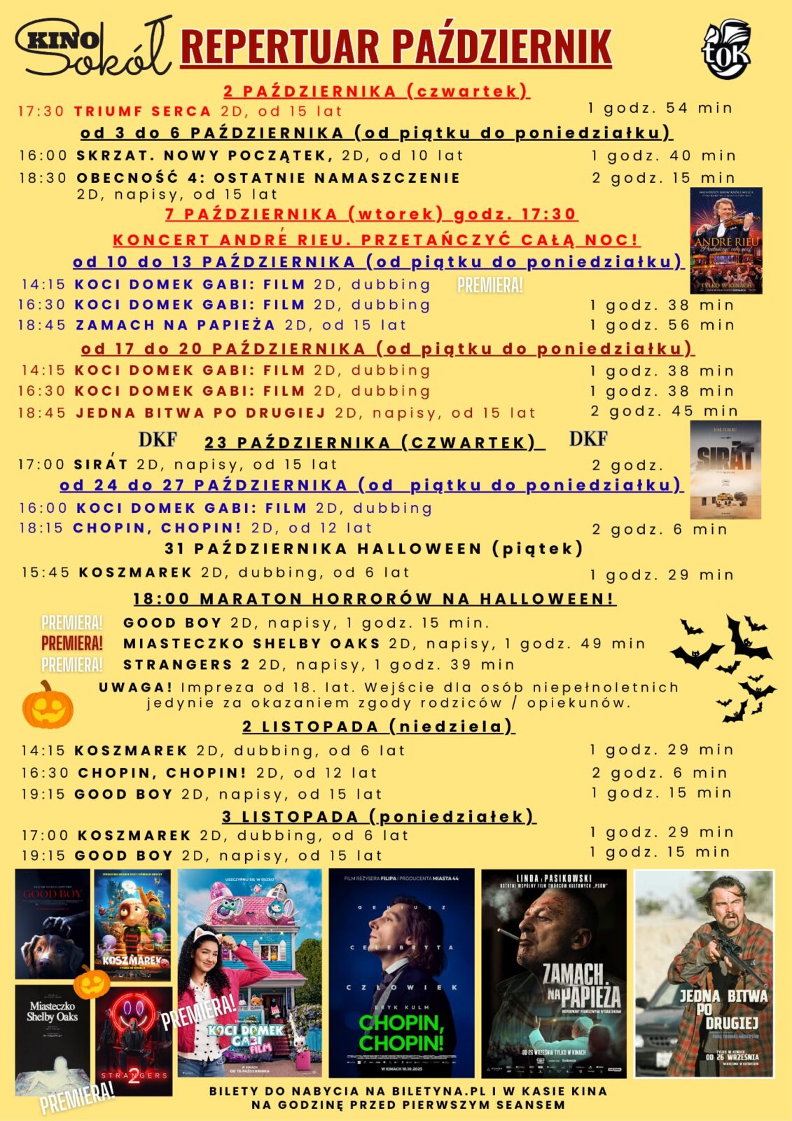 Prawdziwych kinomanów zapraszamy na seans DKF i obraz SIRAT. Melomanom proponujemy KONCERT ANDRE RIEU. PRZETAŃCZYĆ CAŁĄ NOC! Amatorów mocnych wrażeń zainteresuje z pewnością propozycja pod nazwą MARATON HORRORÓW NA HALLOWEEN!