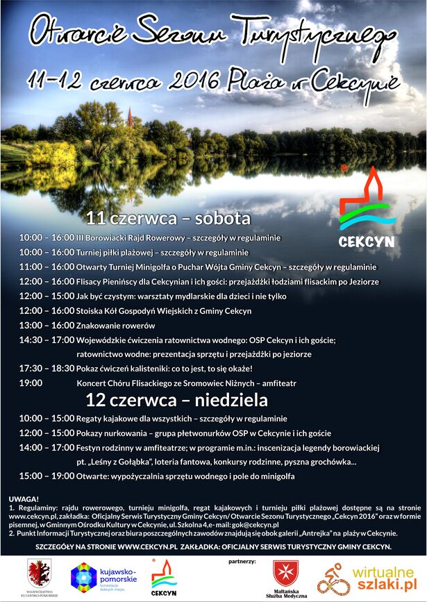 Na mieszkańców i turystów czeka moc atrakcji: otwarty turniej minigolfa o Puchar Wójta Gminy Cekcyn oraz turniej siatkówki plażowej, a także regaty kajakowe. Pokaz ćwiczeń ratownictwa wodnego zostanie zaprezentowany przez Borowiacki WOPR i OSP Cekcyn. Fundacja Maltańska Służba Medyczna z Bydgoszczy będzie nauczać pierwszej pomocy przedmedycznej, będzie można również bezpłatnie oznakować swój rower.