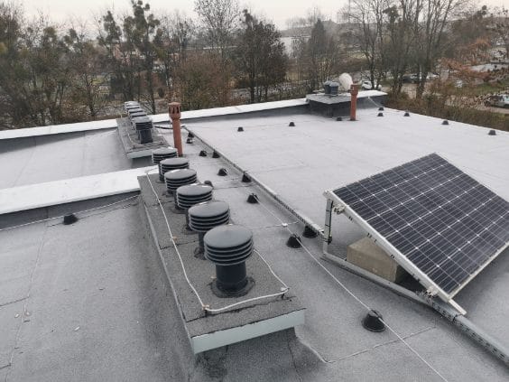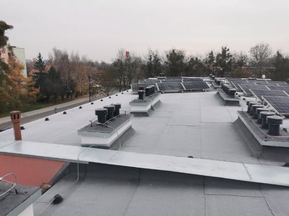 Prace objęły kompleksowe docieplenie wraz z naprawą istniejącego pokrycia. Wykonano również nową instalację odgromową, położono styropapę, dwie warstwy papy termozgrzewalnej oraz wykonano obróbki kominów wentylacyjnych. Dzięki temu dach został zabezpieczony zarówno przed utratą ciepła, jak i przed gwałtownymi zjawiskami pogodowymi.